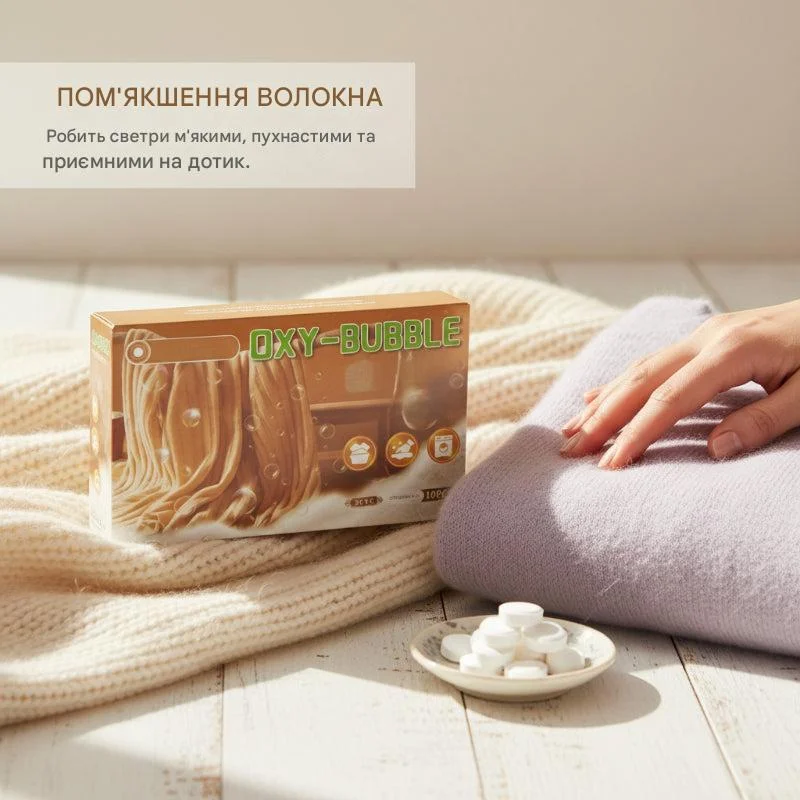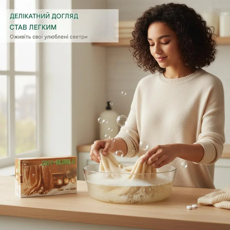 Ферментна формула м’яко розслабляє стиснуті волокна трикотажу, допомагаючи светру повернутися до свого початкового розміру.