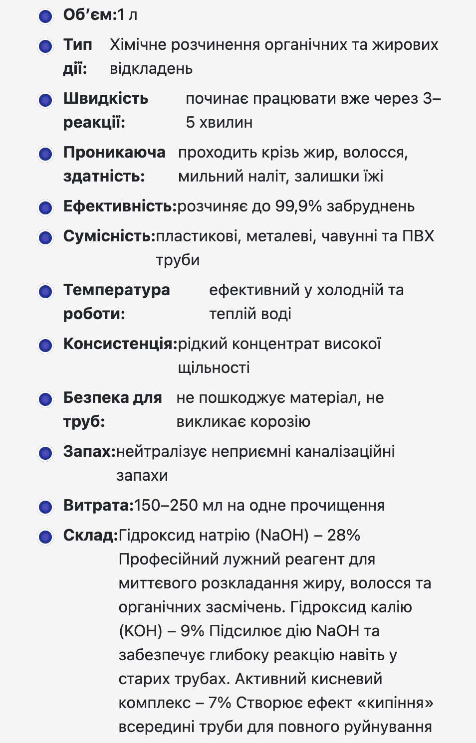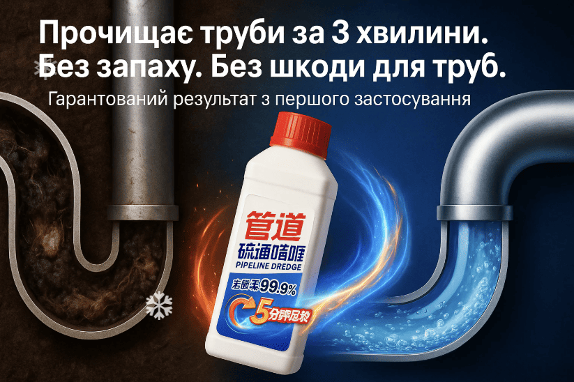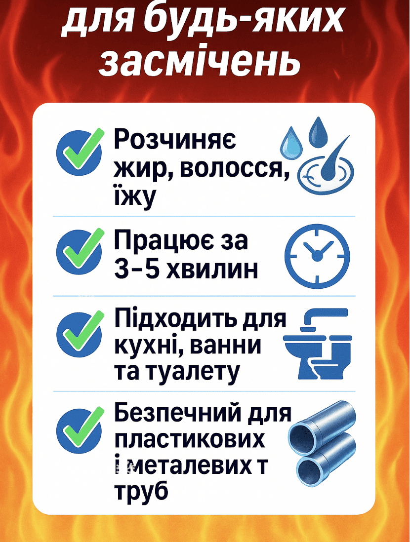 Засіб пробиває затор зсередини: реагенти моментально роз’їдають жир і бруд, перетворюючи їх у рідину. Жодного шансу навіть старим пробкам