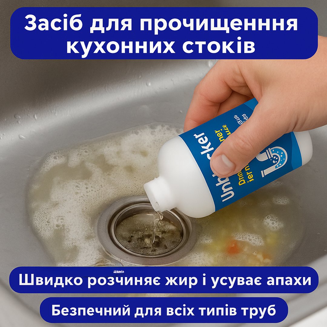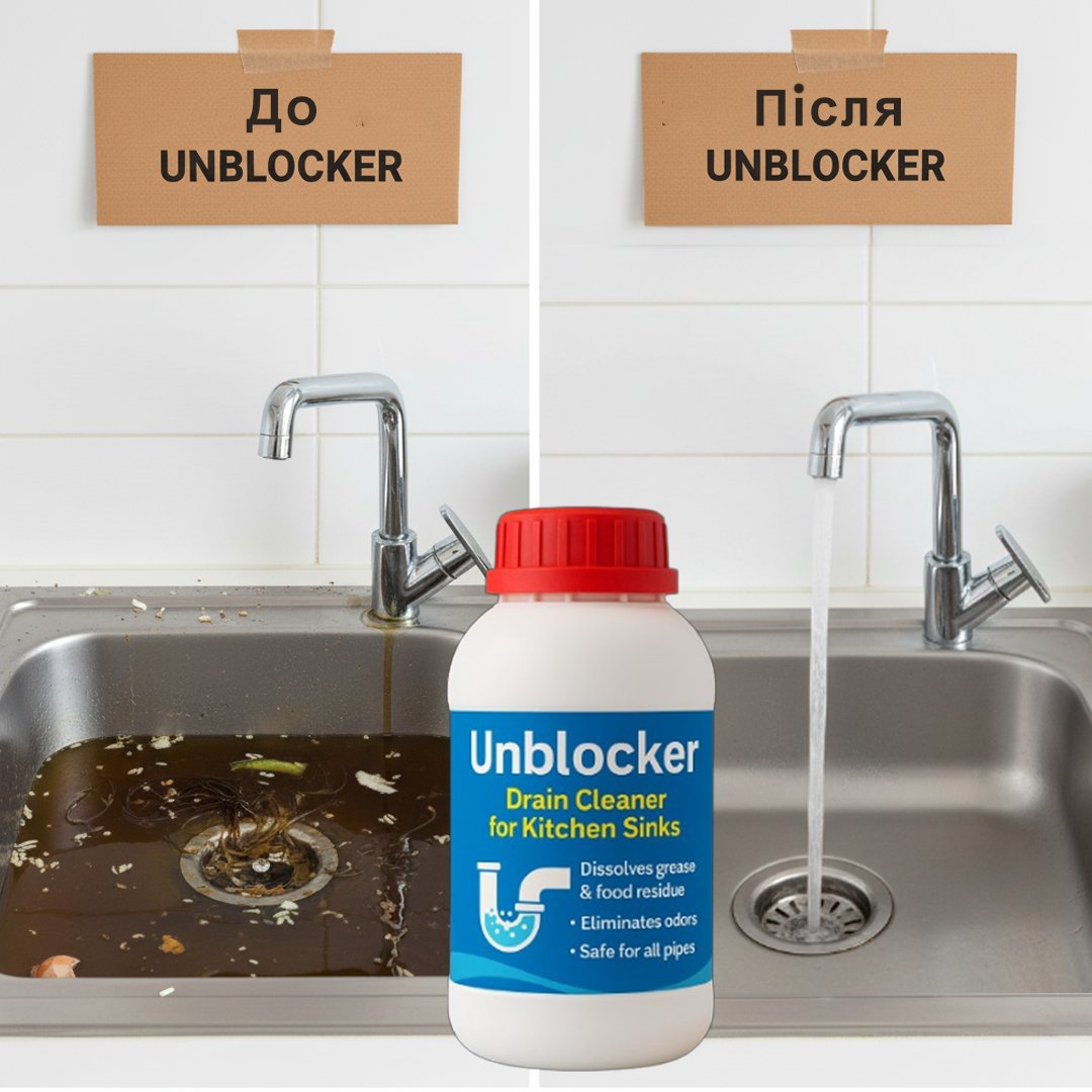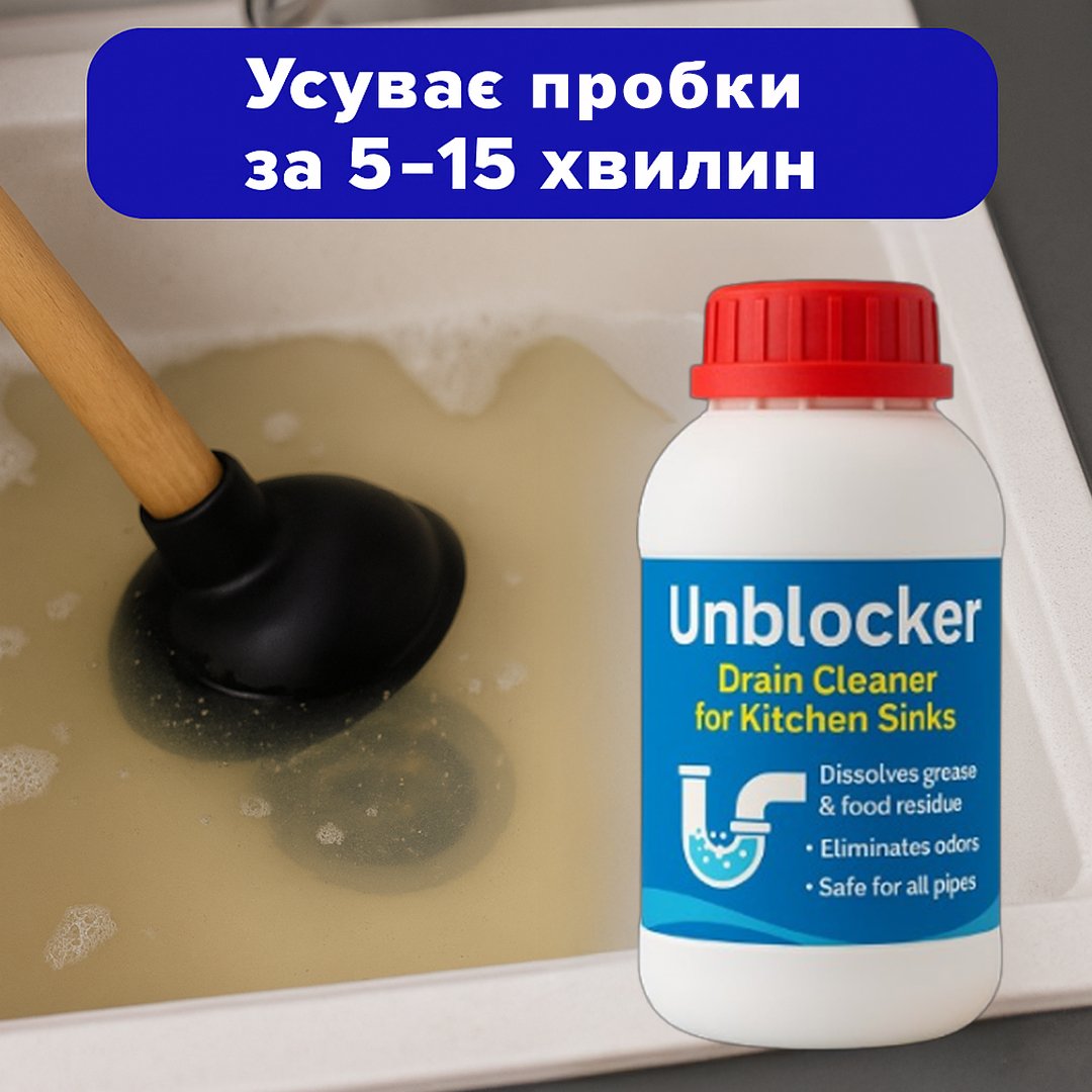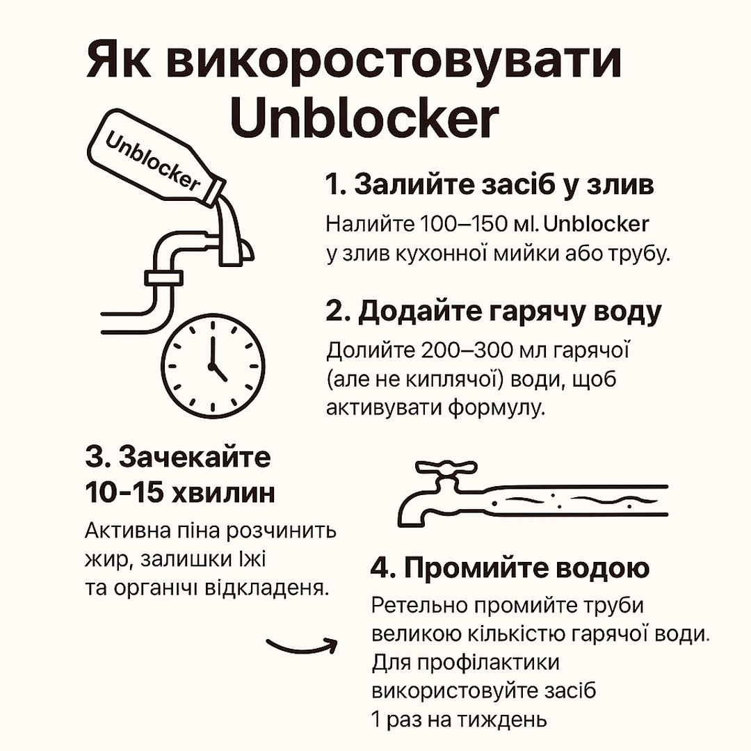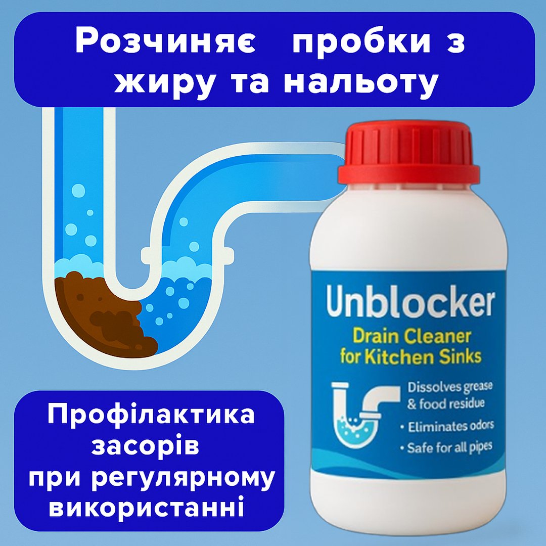 Unblocker розчиняє жирові та органічні відкладення в сифонах і трубах, повертаючи вільний стік і усуваючи неприємні запахи.